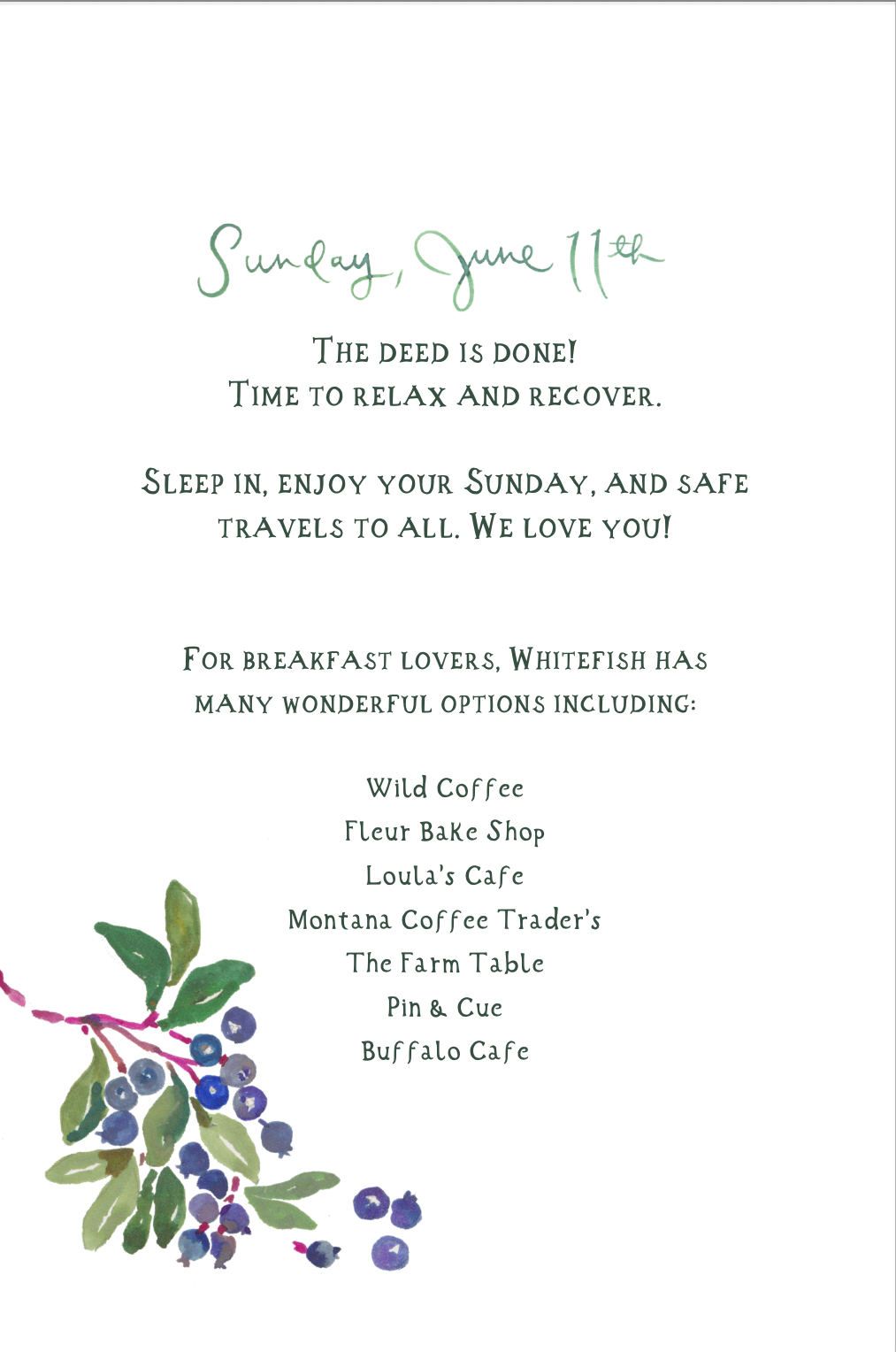 Whitefish Wedding Weekend 06~10~2023 Wedding Paper Friday Bridal Luncheon Welcome Party Make it stand out Pre-Ceremony Wedding Ceremony Cocktail Hour Design Details Wedding Reception Late Night Dancing